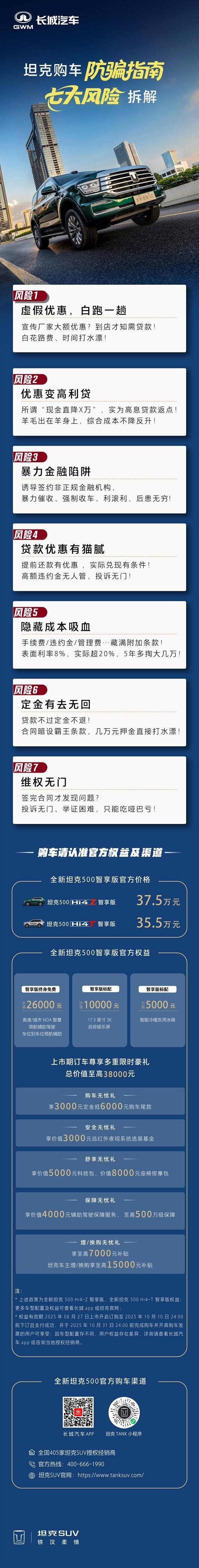 坦克品牌始终以用户为中心,未来将持续以技术创新推动行业发展,以优质服务守护信任。选择全新坦克500,认准官方渠道,方能畅享“能陪家人、能撑场面、能去远方”的全场景出行乐趣,让每一次出发都安心无忧!