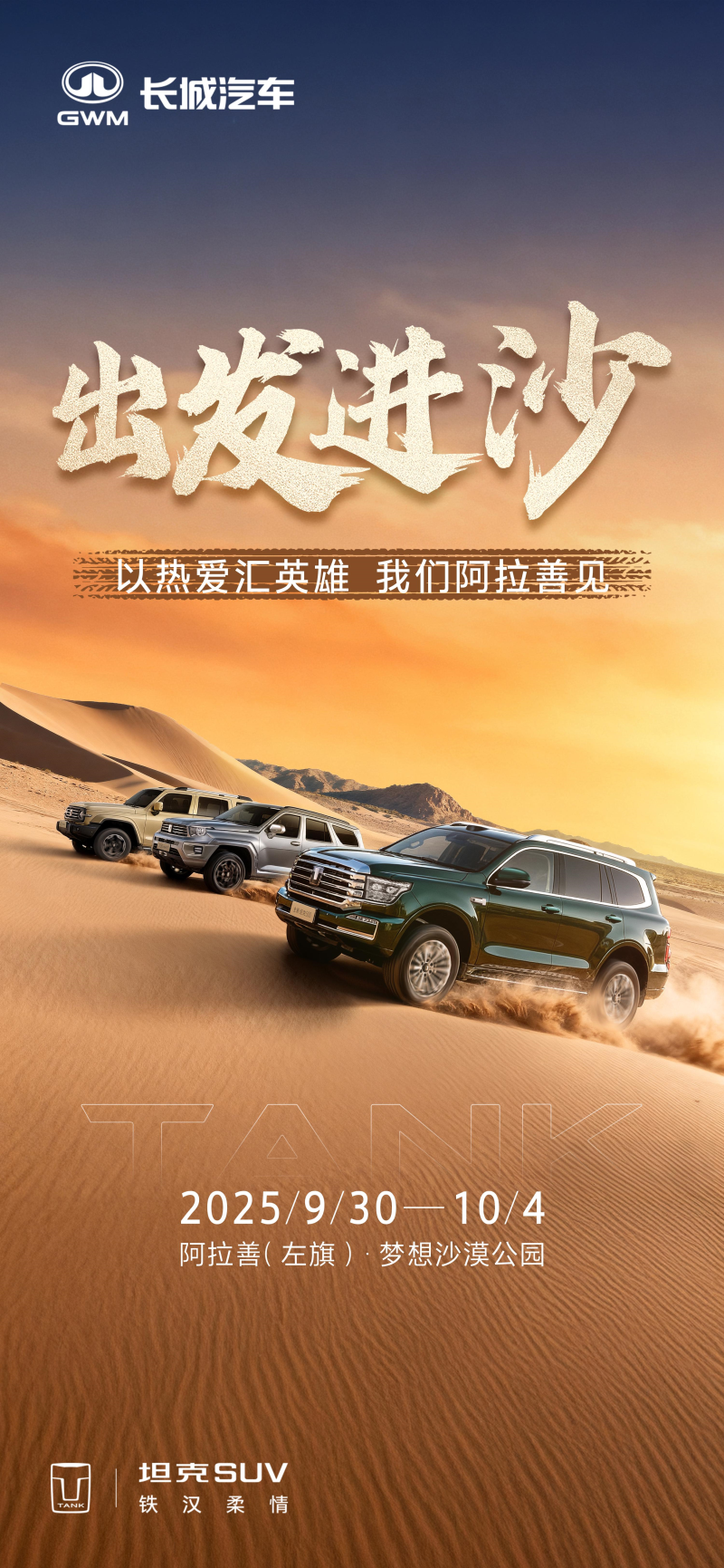 秋色浸染苍穹,黄沙漫卷天地。9月30日,内蒙古阿拉善盟的沙漠腹地,一场属于所有越野爱好者的年度盛典——阿拉善英雄会,震撼开启!坦克品牌将与全国坦客联盟的坦克手集结于此,以1001辆坦克列阵沙海的壮阔场面,致敬祖国华诞;全新坦克500 Hi4-Z也将身披一袭“敦煌绿”惊艳登场,挑战极限越野地标;更有环塔拉力赛、敦煌耐力赛冠军车手亲临现场,带领用户零距离体验“冠军副驾”的非凡激情。这不仅是一场越野爱好者的狂欢,更是坦克品牌与每一位越野爱好者共筑的精神图腾,共同携手推动中国越野文化向善向上的盛举。