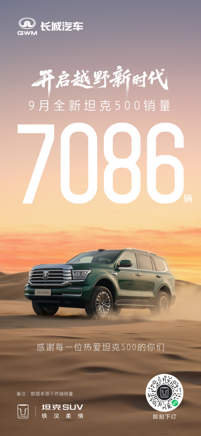 2025年9月,坦克品牌再度交出亮眼成绩单:旗下重磅车型全新坦克500单月销量达7086辆,成为30万级以上新能源越野SUV市场中势头强劲的“销量标杆”。