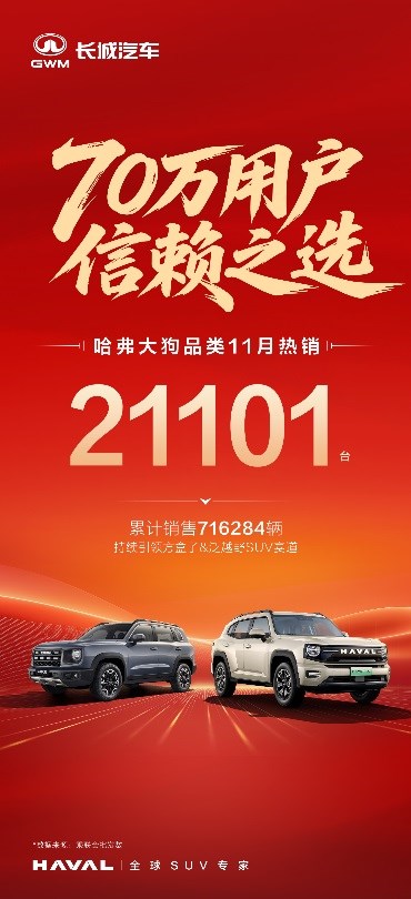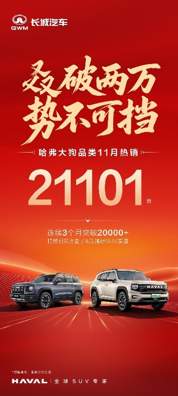 时至年末,中国汽车市场进入激烈角逐,哈弗狗品类再度交出亮眼答卷。11月单月销量达21101台,连续3个月销量破2万,以硬核实力延续热销态势。由哈弗大狗2026款与哈弗大狗PLUS组成的双子星矩阵持续发力,截至11月底,哈弗狗品类2025年累计销售166594辆。狗品类上市以来,累计销售716284辆,实现连续18个月销量破万,累计40个月销量破万,累计43个月登顶泛越野&方盒子品类销量冠军,成为该赛道毋庸置疑的实力王者。(*数据来源:乘联会批发数)